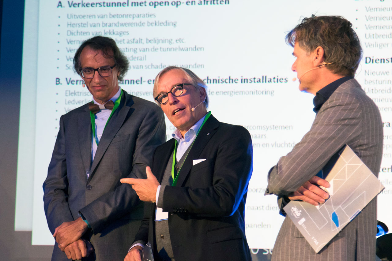 Marcel Hertogh, Peter Schouten en Frans de Kock (van links naar rechts) presenteerden op het COB-congres 2019 in de Gaasperdammertunnel het tweede boek. (Foto: COB/Randy Da-Costa)