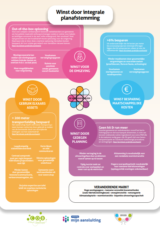 Er zijn interviews afgenomen bij gemeente, provincies en netbeheerders, om praktijkvoorbeelden te verzamelen van situaties waarbij er een concrete winst is of wordt behaald dankzij integrale afstemming. Alle mogelijke documentatie is opgehaald bij deelnemende partijen voor feitelijke onderbouwing. Dit alles is verwerkt in een onepager met factsheet per onderwerp.