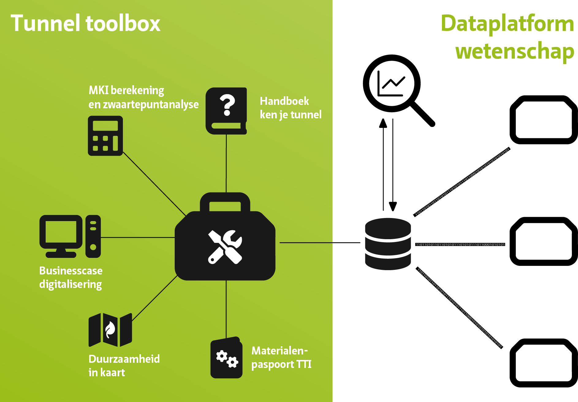 Het instrumentarium is een geavanceerd dataplatform voor wetenschappers waar momenteel drie promovendi onderzoek doen naar de restlevensduur van tunnels. Hun onderzoek richt zich op: