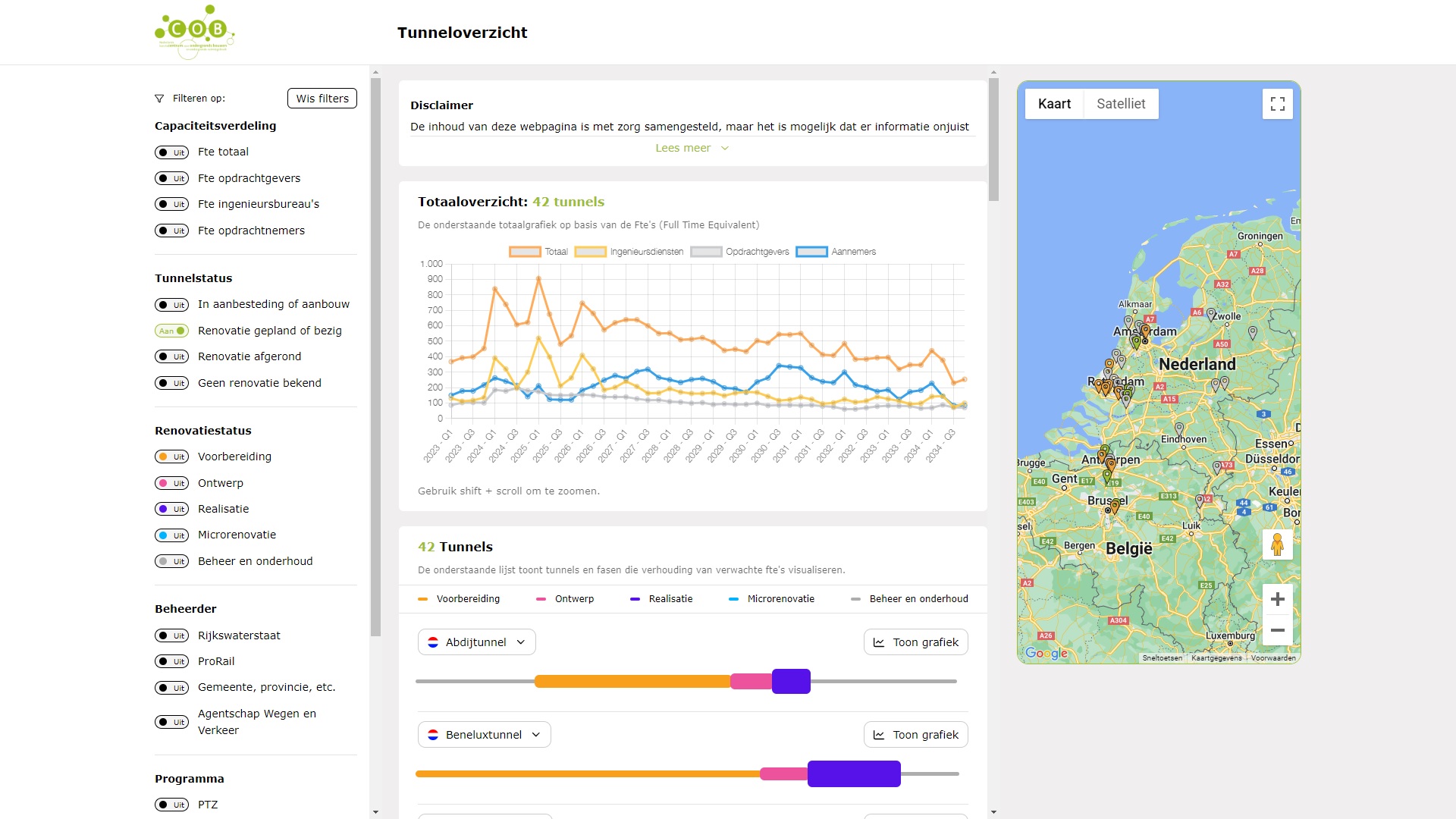 Vanuit de branche bleek er behoefte aan duidelijkheid over hoeveel werk er de komende jaren wordt verwacht bij de renovatie van tunnels. Daarom heeft het COB-netwerk gezorgd voor nadere duiding en verdieping van de gezamenlijke tunnelopgave. Met behulp van tunnelbeheerders en projectleden van renovaties is er een benadering van de toekomstige werkelijkheid gecreëerd in een online tunneloverzicht.